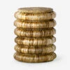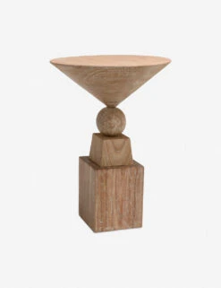 Elemental shapes stack in an artfully balanced arrangement to create a sense of sculptural poise in this mindi wood side table. A light wash finish highlights the beautiful natural grain, offering an ideal pedestal for a house plant or a modern end table for an organic space.