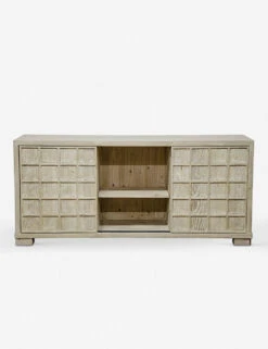 The raised grid pattern on the blank cabinet gives this piece a modern feel, while the reclaimed wood keeps things rustic. Sliding doors open to reveal ample storage space, perfect for concealing electronics in the media room!