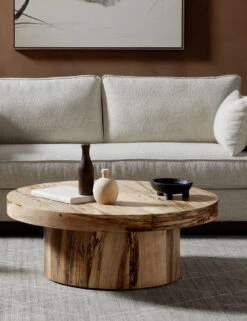 On a pedestal base, this coffee table offers modern design in a natural primavera wood finish that blends well with transitional spaces. The dramatic silhouette of this chunky wood coffee table construction creates the perfect anchor for an industrial aesthetic.