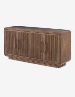 With its large scale, fluted wood door fronts, and rich mahogany finish this sideboard brings statement-making style to your home. A carved plinth base lofts up the rounded corners of its case, and four doors open up to ample interior storage space. This sideboard is finished with blackened brass door pulls, to add a tailored touch