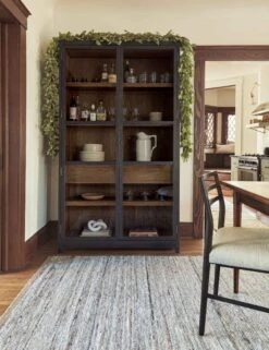 A transitional bookcase with paned glass doors and a black finish. We love how the woodgrain shelving contrasts with the dark frame, putting your favorite pieces on full display.