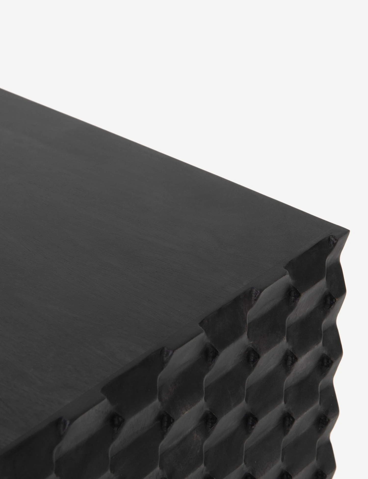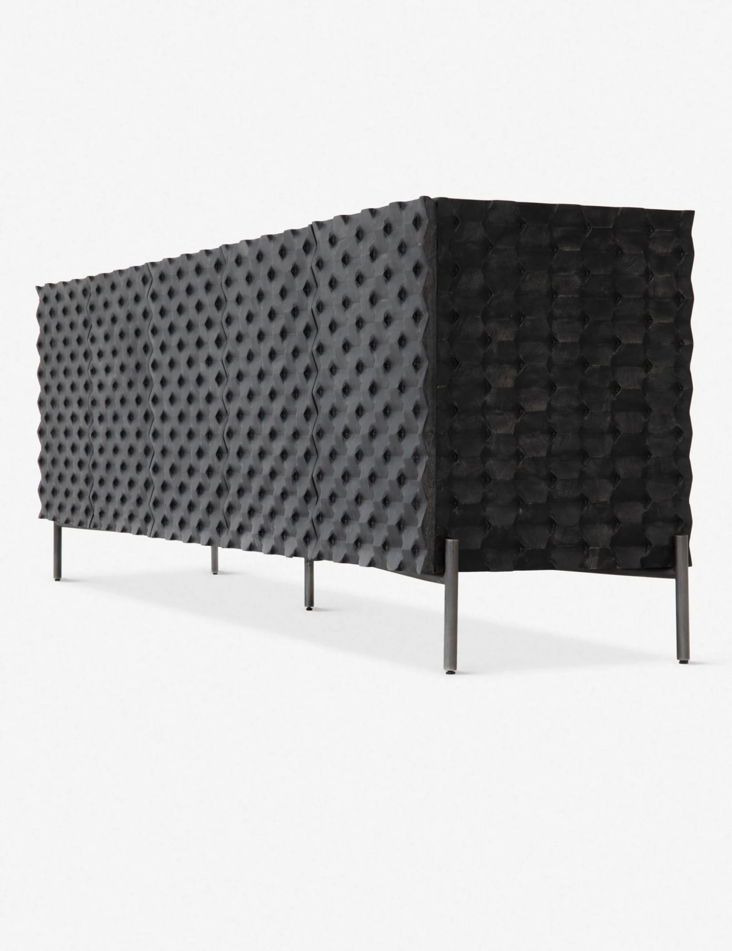 A truly modern piece that will be the focal point of your media room, this wooden console’s unique carved design adds geometric texture in a sleek black wash. Sits on a minimalist iron base.
