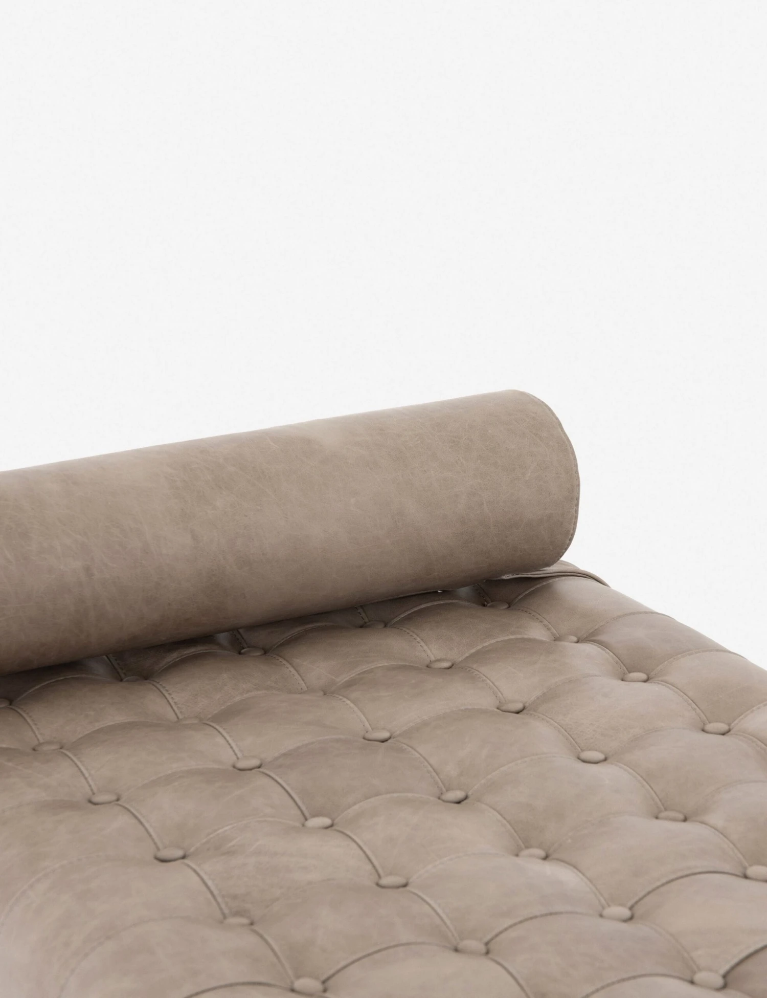 A modern bench with versatile styling options. This tufted leather bench features a simple wooden frame and a round bolster pillow, which can be moved wherever it’s needed for a customized look.