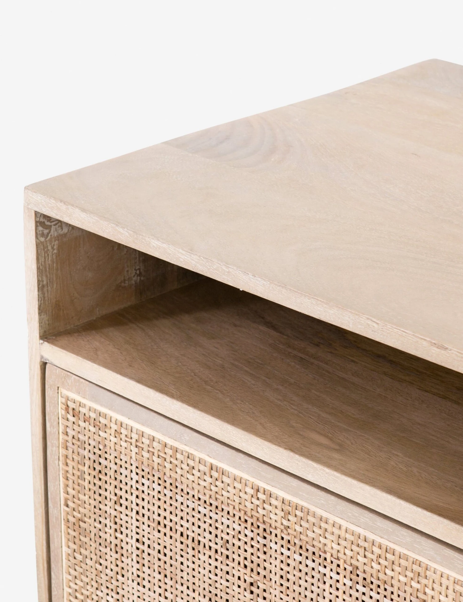 Eighteen inches of depth in this media console means that you’ve found the perfect ample low storage cabinet for your most-used living and dining spaces. The even better news is that this entertainment center looks effortlessly elegant, even when packed with everyday items. Three woven cane doors conceal clutter and contrast against the black or natural finish, while the cabinet’s open shelving above offers room for books and small decor.