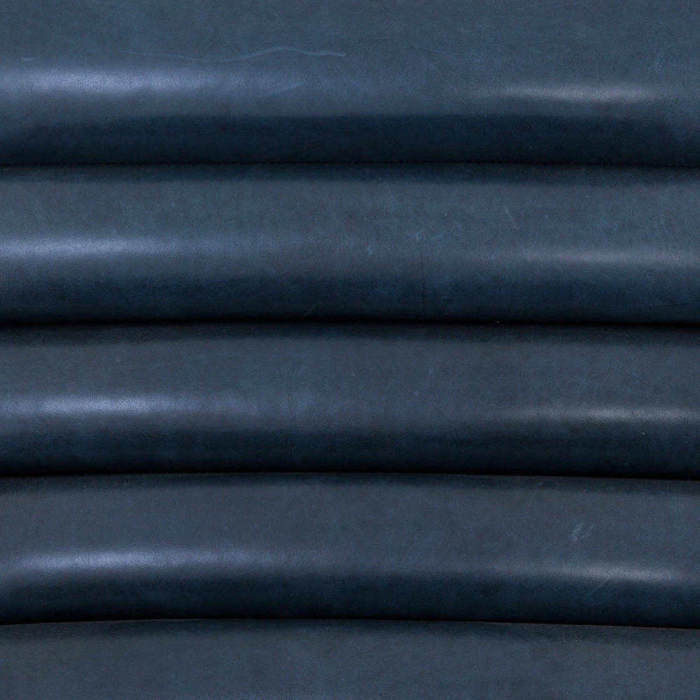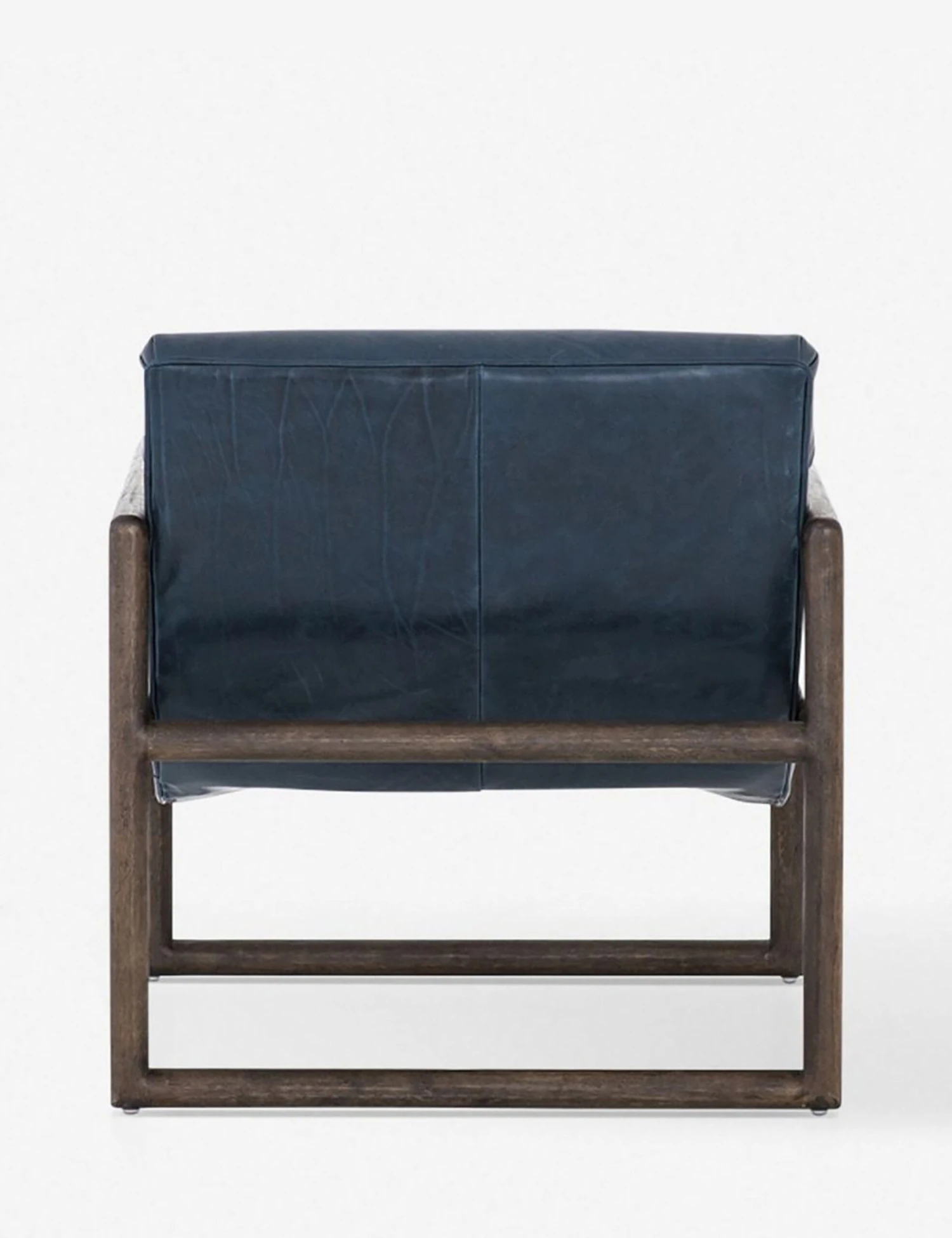 This unique chair plays with shape, combining a curved, low-slung seat and an angular wood frame. Rich leather with deep channeling adds rustic appeal and the deep sapphire tone is versatile and chic.
