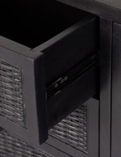 The Isaura media console offers textural impact in black. Its cane-paneled cabinets and drawers provide versatile storage solutions with cutouts behind for cord management. The dowel legs stand apart from the case, framing this console with an artful bearing.