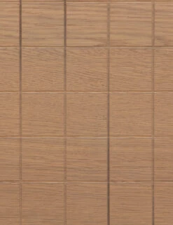 This burnished oak desk is finished with a geometric grid drawer fronts and half-moon hardware to offer up fresh retro undertones. The spacious drawers and open lower shelving provide easy storage in a clean, light wood desk design that is poised for style in your home office.