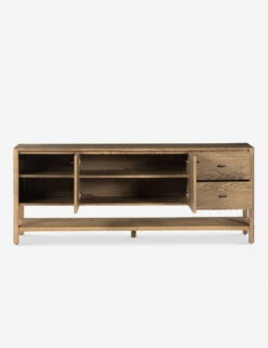 A clean-cut, ash wood design brings Danish-inspired warmth to this Laird media console. Iron arch pulls complete the look, while a woven cord shelf offers added texture. We love the versatile storage with its center cabinet, open shelving, and two spacious drawers—plus rear cutouts ready this console for practical appeal in a family room or den.