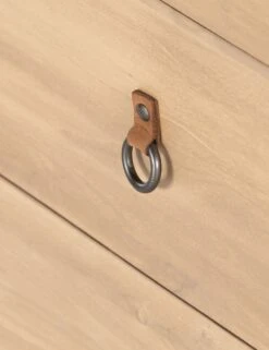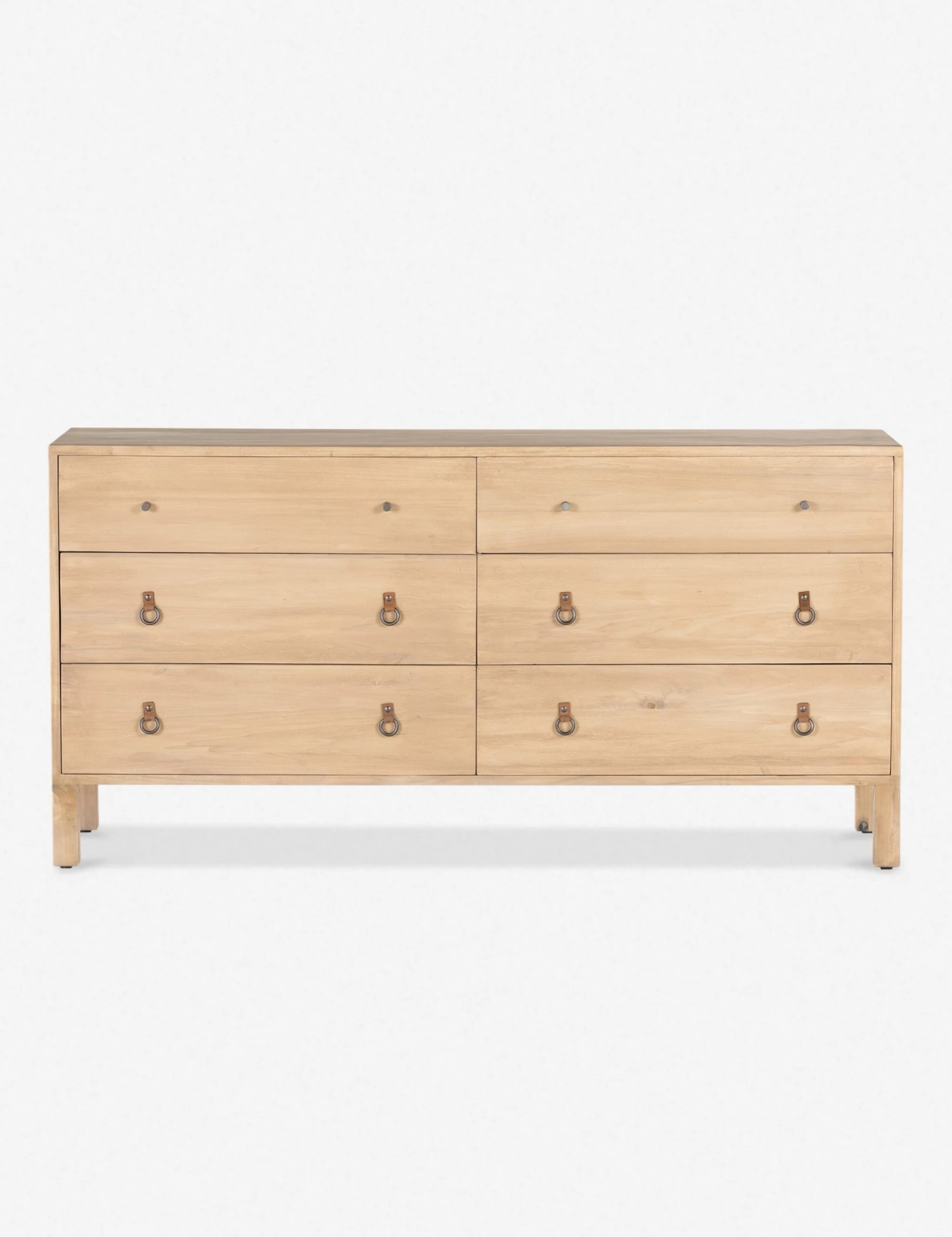 Simply inspired, this solid dry-washed poplar dresser combines clean lines with dovetail joints in a Shaker-inspired design. This wood dresser is finished in a light neutral tone and fitted with iron and leather hardware and six spacious drawers in a versatile, understated style.