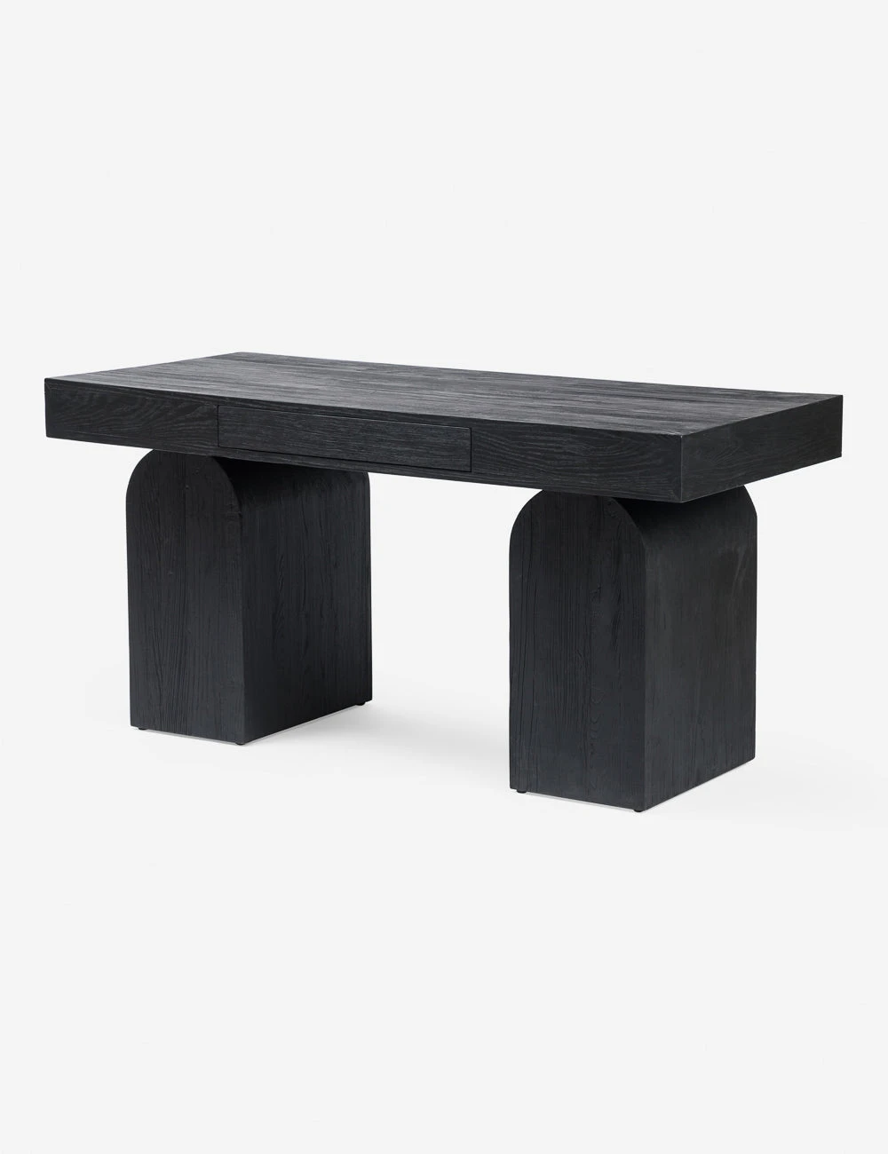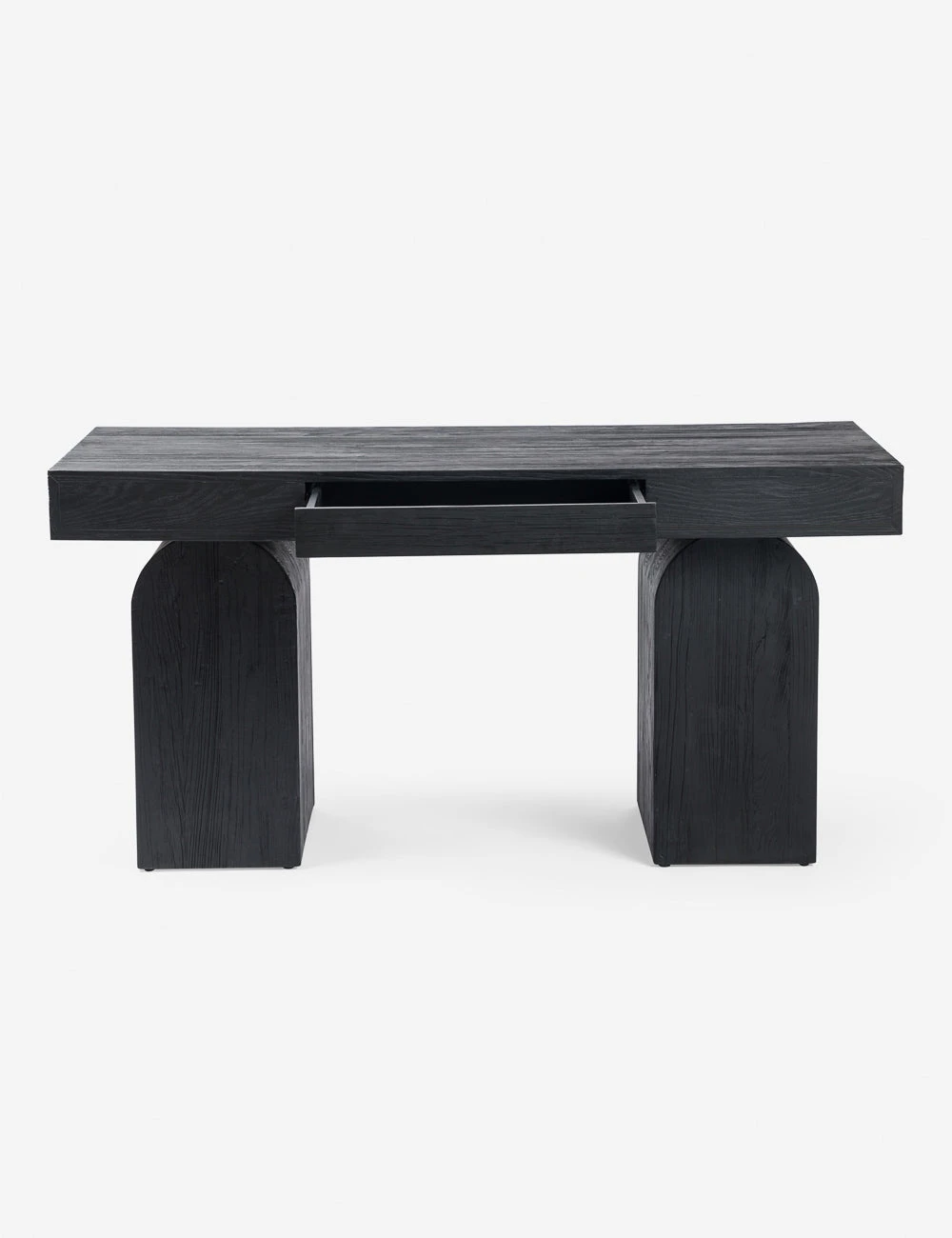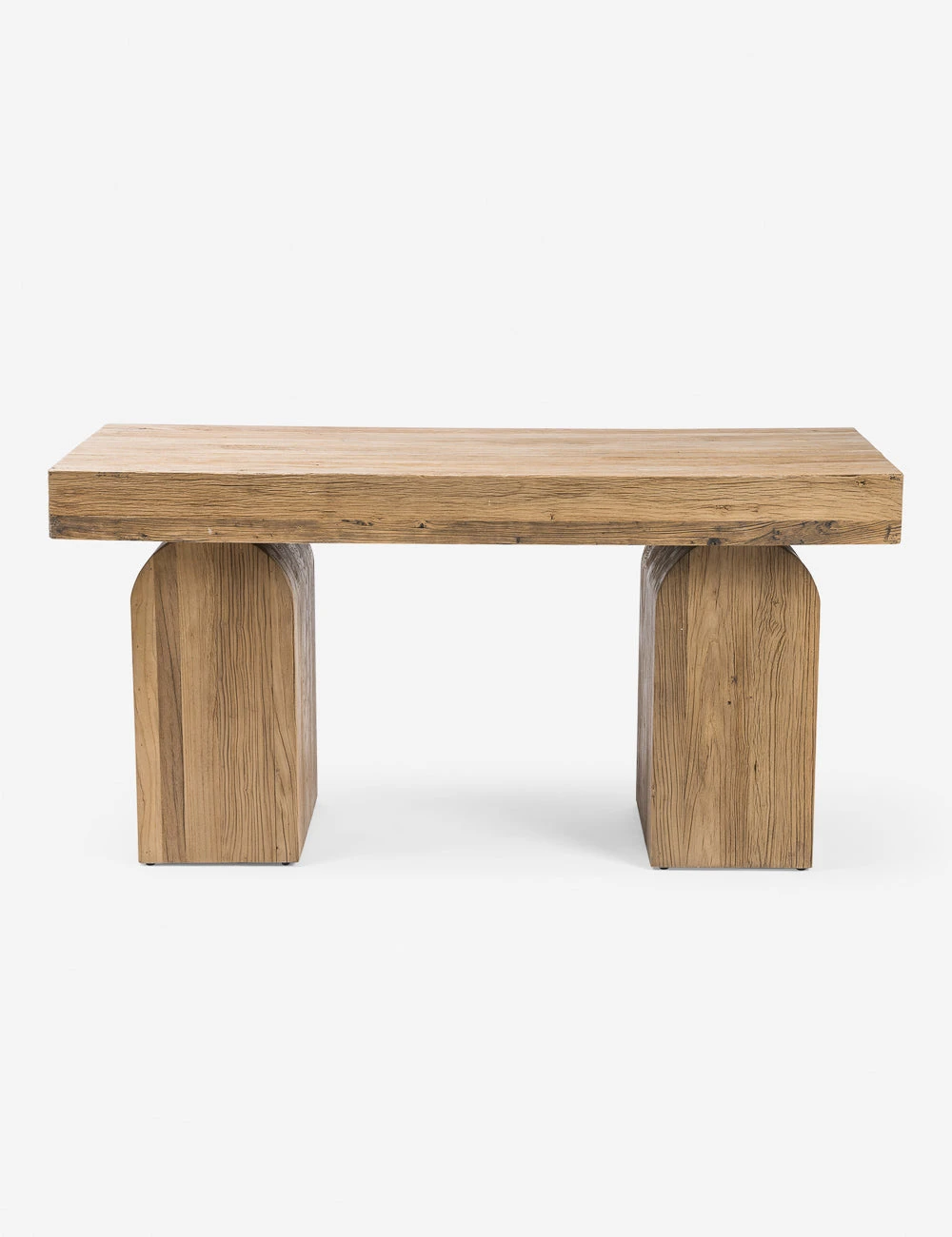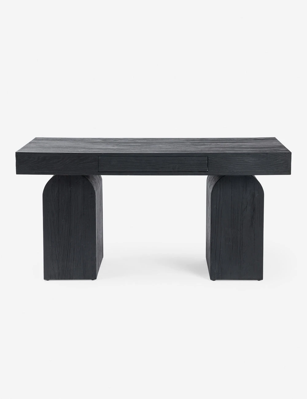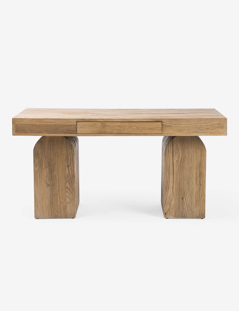 Elemental shapes create an architectural silhouette in this modern desk design. Fashioned from solid elm pieces with beautiful knotting and rich natural grain, two chunky arched legs hold a thick rectangular desktop featuring an inset drawer for sleek storage.