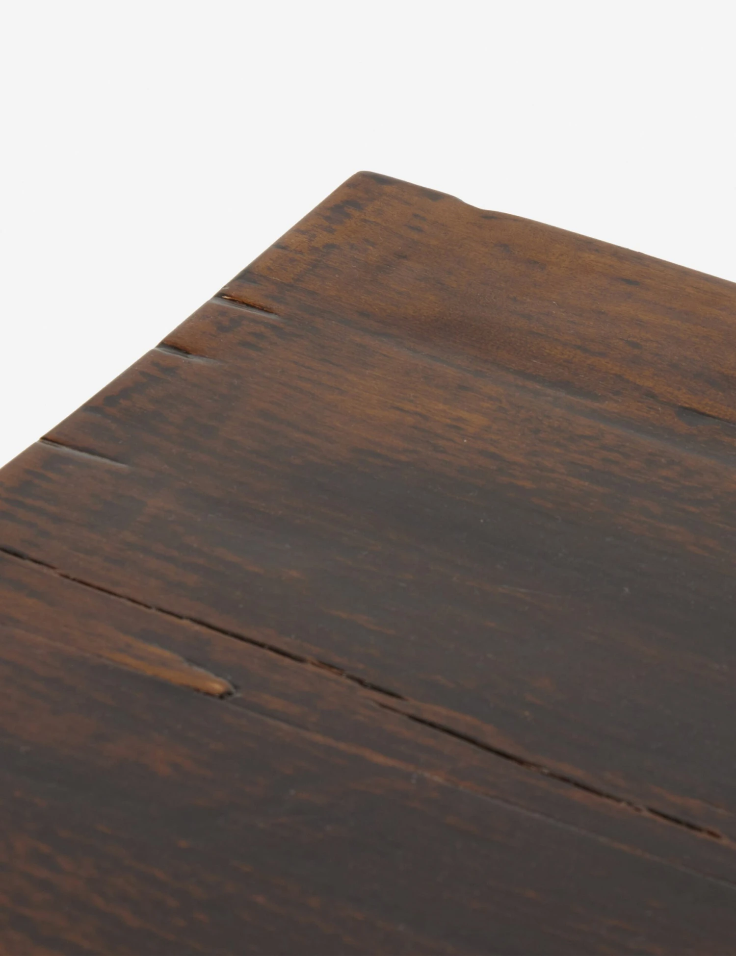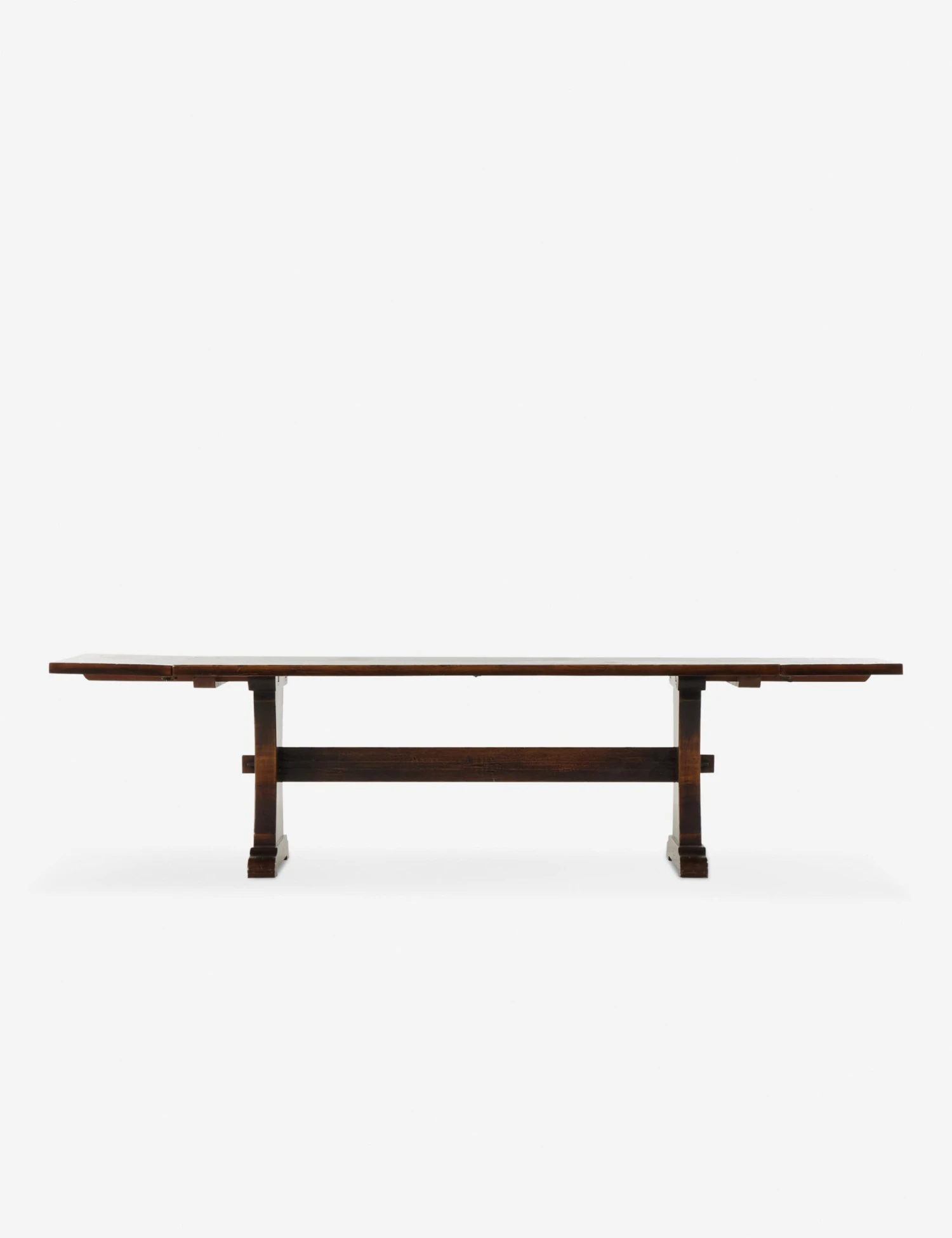 With its classic profile and solid wood construction, this trestle table brings a rustic elegance to dining. The timeless design includes two breadboard extensions, setting the table for ten when attached. The dark tone of the distressed walnut finish evokes a moody and intimate atmosphere.