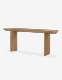 Casting a clean, cut silhouette, this wood console table design is softened by a curved-bottom tabletop sturdily set on two flat, solid legs. Clad in a beautiful oak veneer for natural grain appeal, this hallway table can add a polished touch with organic warmth to your entryway or living space.