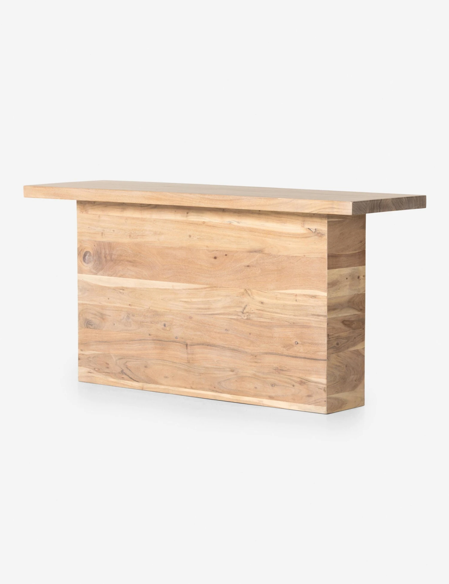 The Ridley console table brings elevated design to an elemental form. A crisp silhouette showcases the natural grain warmth of the solid acacia wood construction, fashioning the perfect console for a showstopping entryway or a grounded modern lounge.