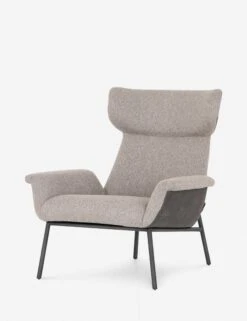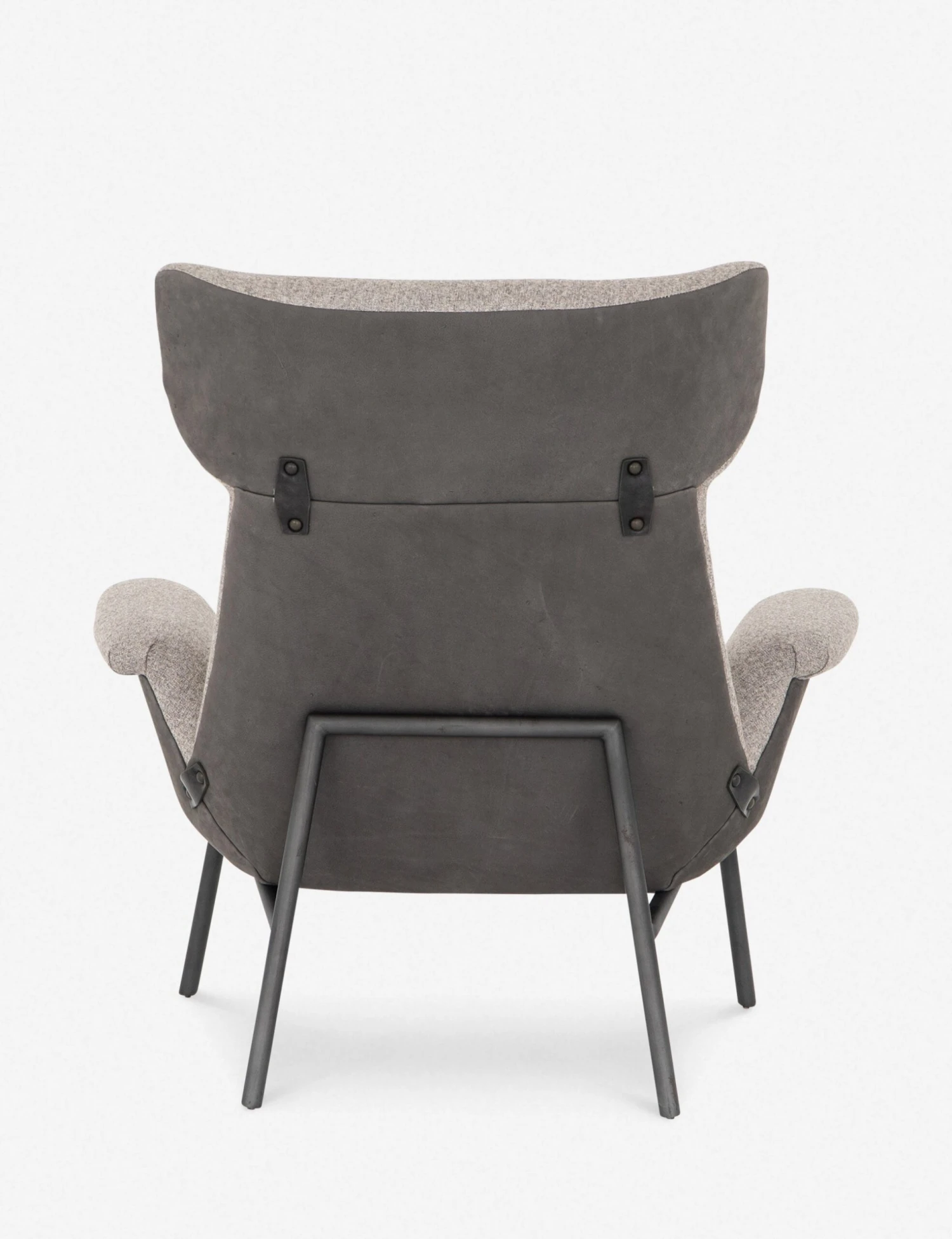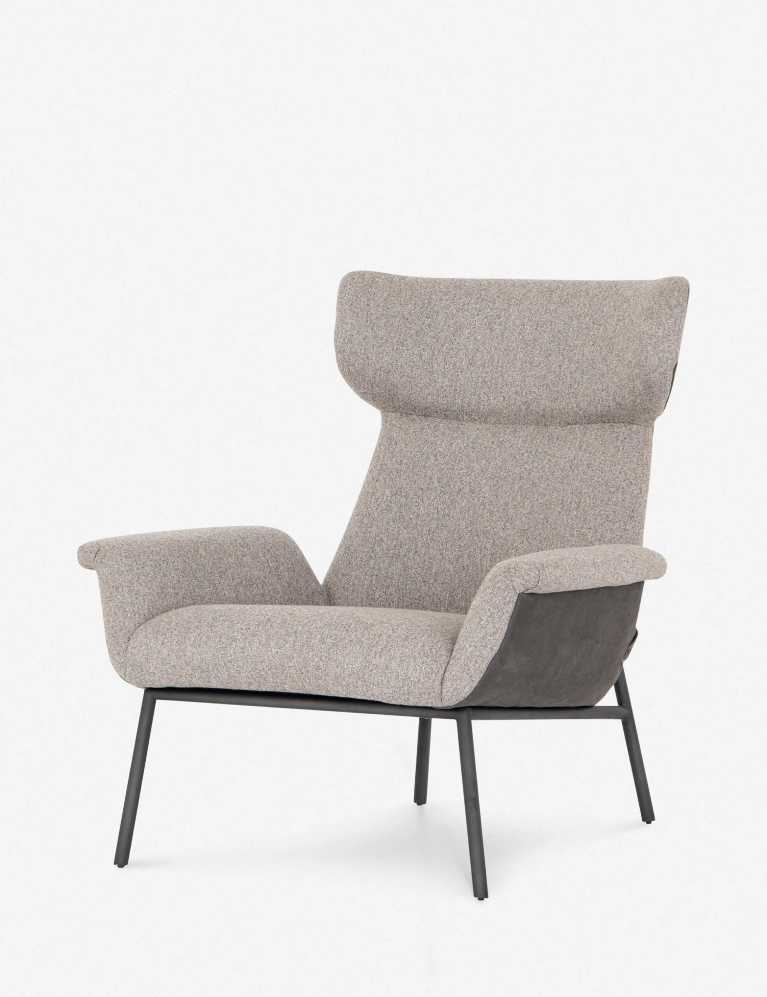 Classic wingback style is given a fresh update with this dramatic accent chair. Clad in a two-tone upholstery of herringbone-like fabric and supple top-grain leather, then finished with grommet straps at the sides and back, this chair is made for comfort and tailored for a refined aesthetic that blends traditional touches with modern design.