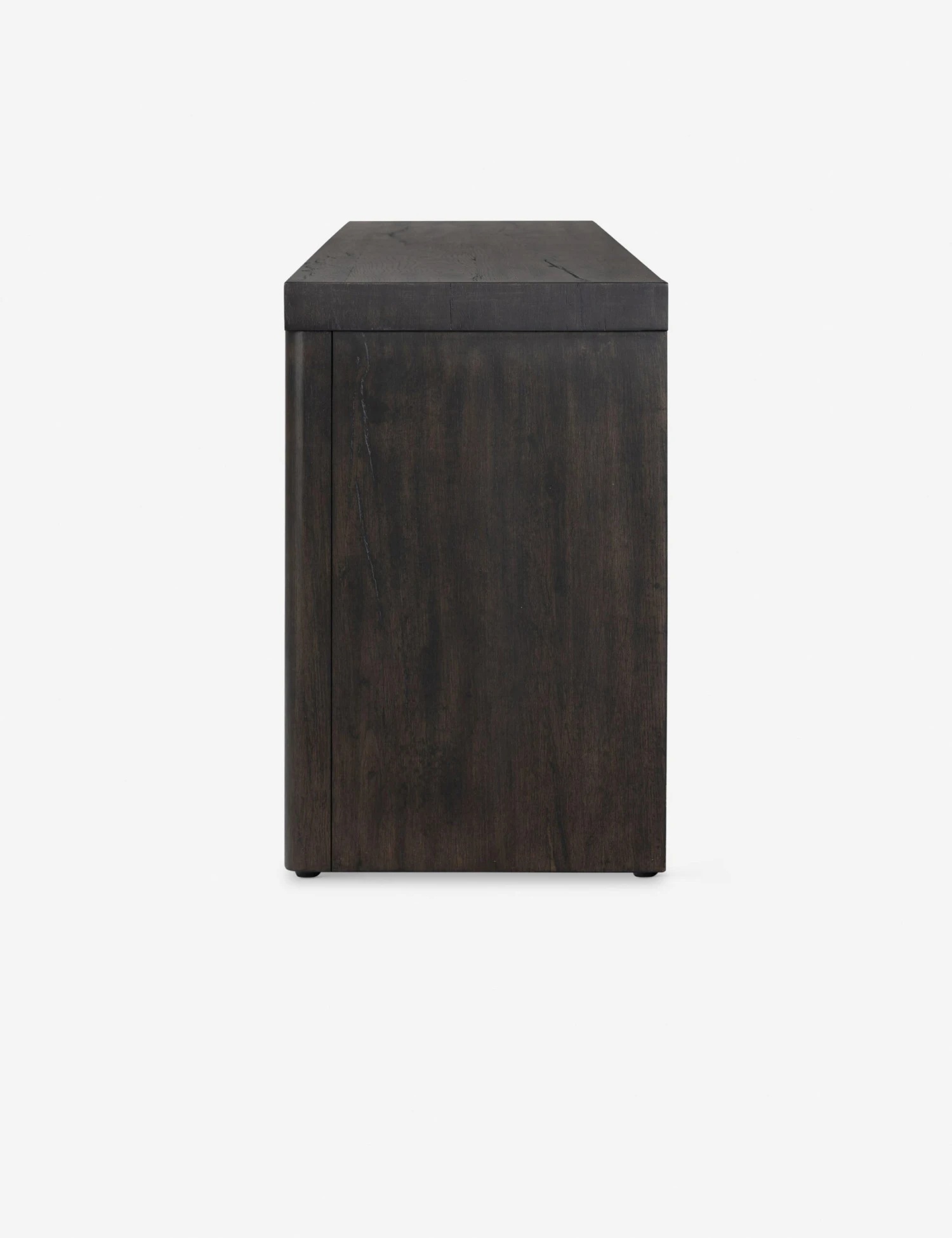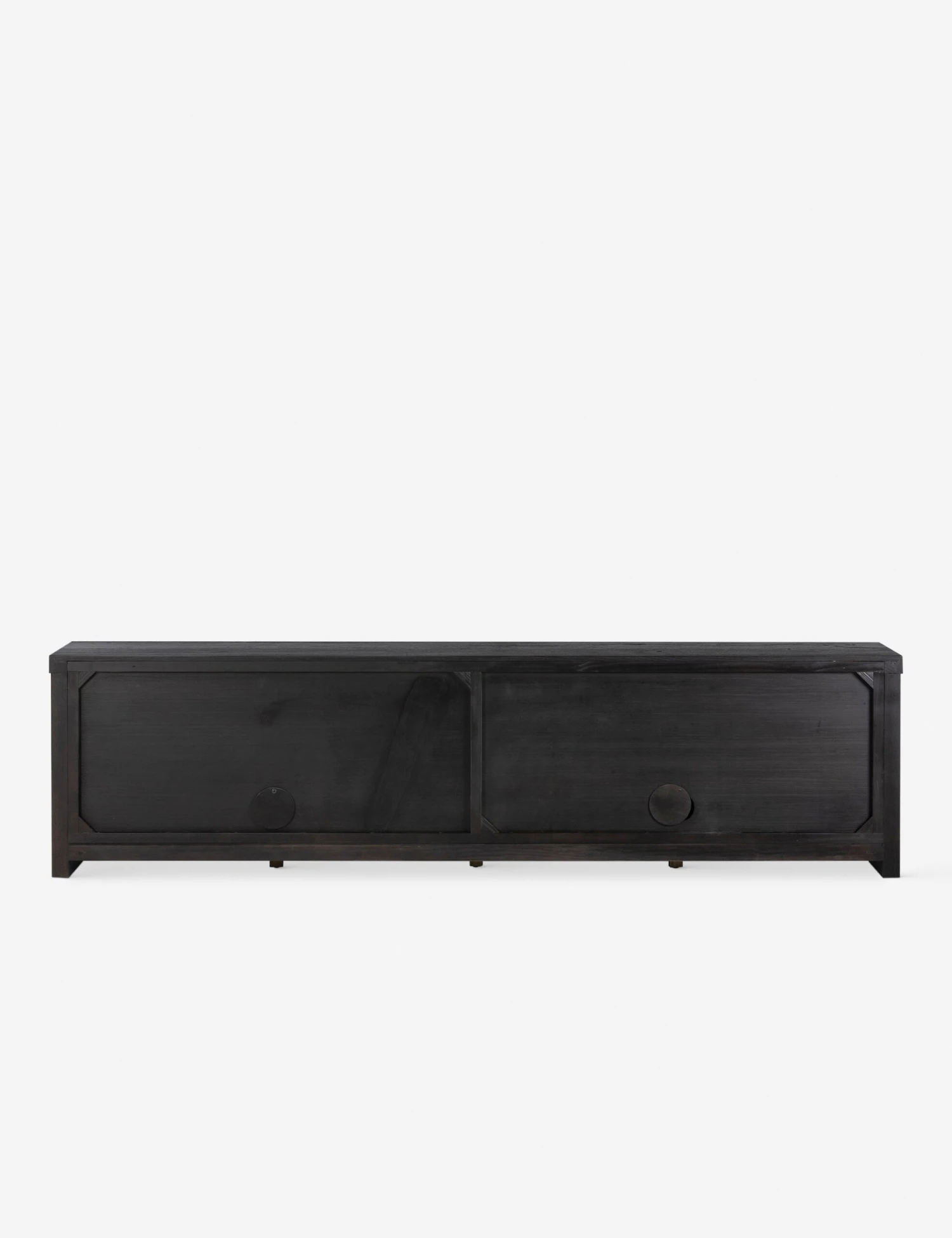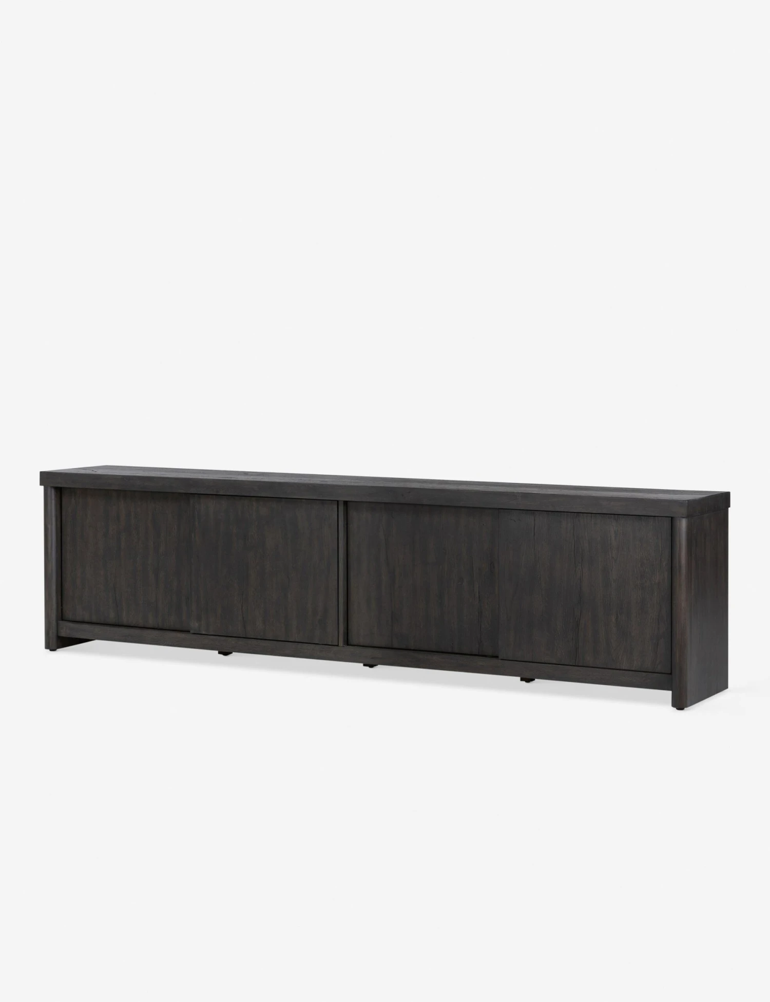 The Todaro media console grounds the room with understated elegance. Its dark-finished oak veneer features a weathered finish, adding patina and character to the sleek architectural lines. With the sliding cabinet doors and rear cutouts for cord management, you can fold all your modern elements into a timeless curation.