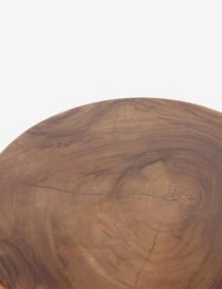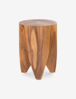 This chunky wood side table is carved from solid teak to offer natural grain texture with a sculptural edge. Finished for outdoor or indoor use, this end table blends organic style with a polished appeal.