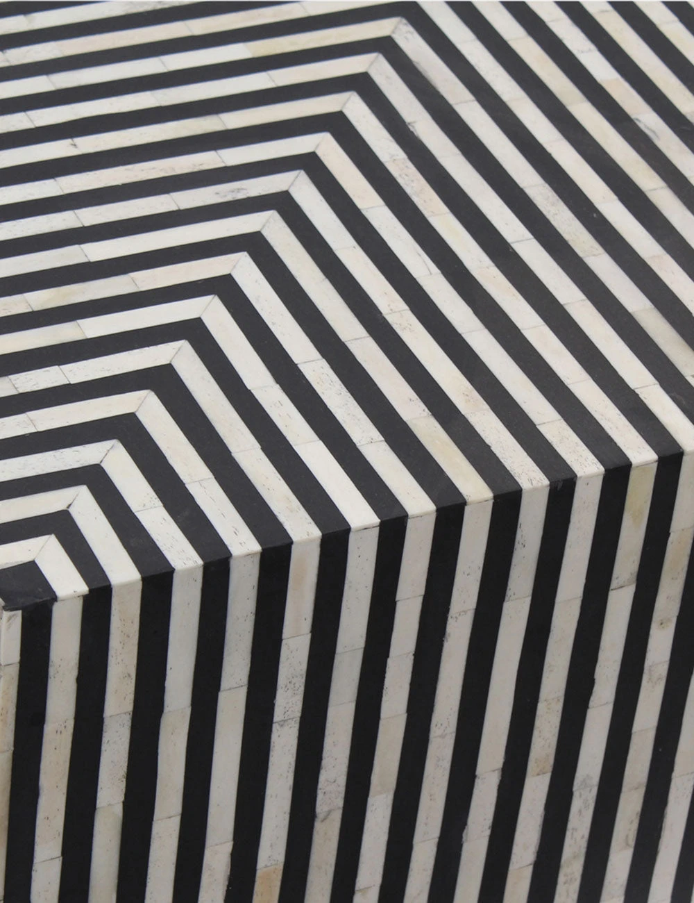 A sleek cubic form comes alive with a bold deco veneer in this coffee table. The contrast of the vibrant geometry creates striking impact in a statement-making design. We love this new black and white coffee table for an eye-catching centerpiece in a richly collected space.