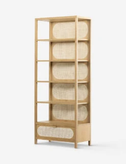 Honey-finished oak and oval-shaped cane paneling inspire transitional appeal in the Verna Bookcase. With a spacious lower drawer and clean, streamlined frame, this bookcase offers effortless warmth with plenty of room for storage and display.